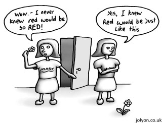 Η Μαίρη είναι επιστήμονας και μένει μέσα σε ένα ασπρόμαυρο δωμάτιο από το οποίο δεν υπάρχει έξοδος. Η ειδικότητα της είναι η μελέτη των χρωμάτων με αποτέλεσμα να γνωρίζει τα πάντα για αυτά όπως το μήκος κύματος τους, το αποτέλεσμα των συνδυασμών τους, ποια μέρη του αμφιβληστροειδούς διεγείρει το καθένα κτλ. Παρ’ όλα αυτά μένει μέσα στο ασπρόμαυρο δωμάτιο και δεν έχει βιώσει ποτέ κάποιο χρώμα. Μία μέρα όμως δημιουργείται μία έξοδος στο δωμάτιο και η Μαίρη καταφέρνει να βγει στον έξω χρωματιστό κόσμο όπου βλέπει και βιώνει τα χρώματα.