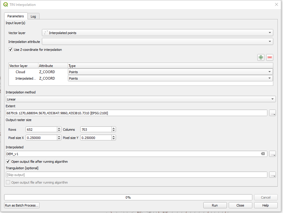 Εικόνα 2: Στον αλγόριθμο TIN Interpolation εισάγονται δύο point Shapefiles. To 1o με το όνομα CLOUD αφορά τα μετρημένα σημεία, ενώ το 2ο με το όνομα Interpolated points αφορά τα σημεία που προέκυψαν από τον αλγόριθμο Points Along Geometry. Από τον αλγόριθμο παράγεται το αρχείο tiff με όνομα DEM_v1.