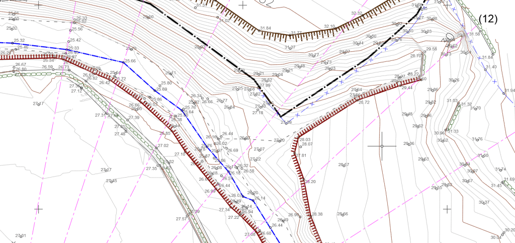β) Αναγνωρίζουμε τα γραμμικά στοιχεία του σχεδίου μας. Το φρύδι και το πόδι του πρανούς είναι δύο τέτοια γραμμικά στοιχεία, τα οποία αποτελούνται από μία σειρά σημείων. Ο άξονας ενός υδατορεύματος, μία ξερολιθιά και μία συρματοπερίφραξη επίσης είναι γραμμικά στοιχεία. Σημειώνεται πως το πόδι και η στέψη του ίδιου τοιχίου είναι δύο ξέχωρα γραμμικά στοιχεία.